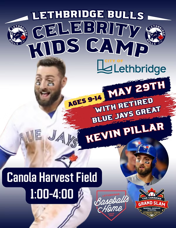 The Lethbridge Bulls Celebrity Kids Camp takes place May 29th at Canola Harvest Field in Lethbridge, featuring special guest, retired Toronto Blue Jays great, Kevin Pillar. Open to players ages 9-14, this exclusive experience gives young baseball players the chance to learn directly from a Major League veteran while developing their skills in a fun, high-energy environment. Participants will take part in drills, instruction, and on-field activities alongside Pillar and players and coaches from the Lethbridge Bulls, all as part of the excitement surrounding the Canadian Grand Slam of Baseball. It’s a unique opportunity for young ballplayers to sharpen their game, meet a pro, and create unforgettable memories on the field.